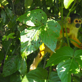 Une bande de saimïris (petits singes jaunes) en liberté anime le lieu par leurs sauts impressionnants d’arbres en arbre, et montent parfois sur les gens.