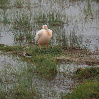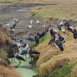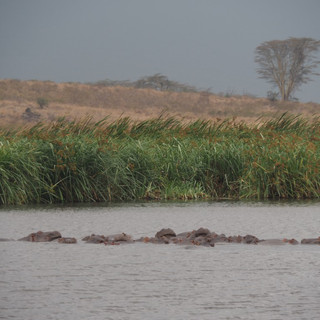 Les marécages, foisonnants d’innombrables oiseaux ( flamands, pélicans, aigrettes, spatules, ibis, grues, calao trompette(hondo hondo) ), laissent seul apparaitre le dos des hippopotames, immergés tout le jour.