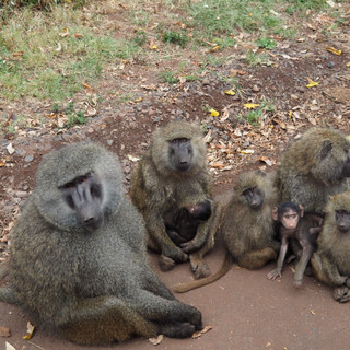 A peine entrés dans le parc de Manyara, étroite bande de quelques centaines de km2 prise en le lac du même nom et la vallée du rift, nous sourions déjà , complices devant l’intimité d’un couple de babouins (Olive baboon) s’épouillant amoureusement au milieu de la piste, aucunement dérangé par notre présence. Surviennent ensuite leurs cousins singes bleus et singes à casquette (cape monkey). Des papillons ou oiseaux multicolores foisonnent dans les arbustes jouxtant le chemin : martin pêcheur (kingfisher), le guepier mangeur d’abeilles (bee eater), le sunbird. Egalement deux beaux calao rouges et noirs.