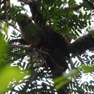 Rejoignant la fôret, nous croisons au sol un petit fourmilier noir , en l’air un bel écureuil gris, tous deux très craintifs.