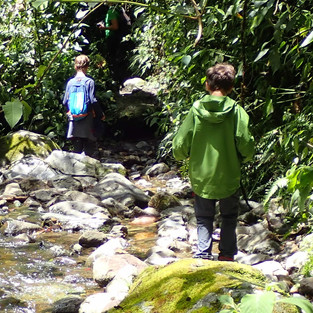 Marchant dans la gadoue, le long du rio Quindio, sautant sur les rochers, enjambant les plaques manquantes des passerelles de bois ou s’arrêtant pour prendre des photos nous arrivons à la maison des colibris. Là-bas, une trentaine de colibris vivent en liberté, nourris à l’eau sucrée. Nous les regardons longtemps en buvant aussi une agua panela (eau sucrée). Ensuite, nous continuons notre route vers le haut et arrivons dans une grande prairie de palmiers géants.