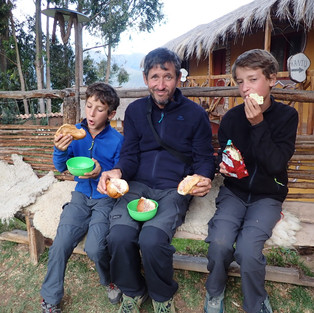 Un peu plus tard, nous demandons à l’unique personne du village si il y a un hôtel, pas très loin d’ici et il nous ouvre la porte de son « hospedaje » et conduit dans une belle chambre avec vue sur Petit Cusco. Une pièce de leur petite ferme est consacrée à l’élevage des « cuys » (cochons d’inde) qui finiront en rôtis. Il y a les bébés avec leurs mamans, les jeunes et les « maduros » (murs, à point !). A 19h, alors que je m’endormais déjà, quelqu’un toque à la porte et nous propose de manger du « choclo con queso ». Nous y allons et découvrons une pièce chauffée par un bon feu. On nous offre un thé de muna (sorte de menthe très odorante) bien chaud, une belle assiette de maïs bouilli accompagné de fromage que nous rongeons en bavardant avec nos hôtes. Nous sortons, et là surprise, un ciel étoilé flotte au dessus de nous ! Splendide.