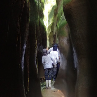 Nous nous sommes promenés dans la jungle jusqu’à un étroit canyon recouvert de mousses, avec araignées, chauve souris,et de l’eau jusqu’aux genoux.