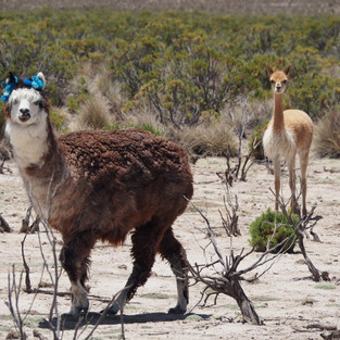 Il existe 4 espèces de camélidés en Amérique du sud :la vigogne, le guanaco, tous deux sauvages, le lama, et l’alpaga, eux domestiqués. Nous en avons vu 3 sortes : la vigogne a une robe rousse claire et une tête de chameau portée sur un long cou gracieux . Nous en avons vu en vrai et empaillées. Elles font exactement la taille de Simon.