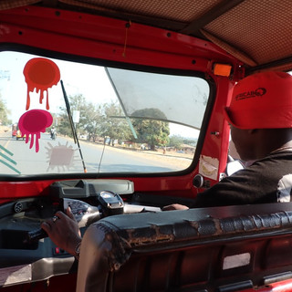 Il y a plein de moyens de transports plutôt bizarres : les tatas, appelés « daladala » : des vieux bus tous petits et tout le temps bondés on pense qu’on ne plus y faire rentrer un chat, mais on rentre à quatre avec nos gros sacs, les tuk-tuks ou : des guidons de moto avec des sièges protégés du vent et de la pluie à l’arrière, on pense qu’on ne rentrerait pas, mais à 4 avec nos gros sacs, ça passe !