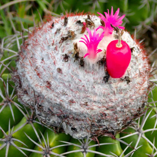Tous dotés de profondes racines fixant la terre sableuse, certains cactus sont géants, certains nains , ces derniers portant de petites fleurs et des fruits semblables à de petits piments roses fluo plantés dans leur casque.