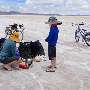 Ambiance décontractée et familiale à la casa Pingui (Casa de cyclistas), foyer où les cyclistes aussi bien que de jeunes étrangers en exil, ou encore les chiens de la rue trouvent un accueil chaleureux et amical. Ville pavée, décatie, quadrillée en blocs par de larges rues pavées, bien inondées pour la plupart. Cimetière de train, tas de ferraille d’un âge d’or révolu comme unique attraction touristique. Lieu de départ vers des trésors sauvages du Sud Lipez, et notamment du parc national Avarao, fermé devinez pour quelle cause et on ne sait pourquoi. Lointain, désertique, il est inaccessible en vélo pour nous, mais nous nous promettons un jour de revenir contempler au soir la laguna colorada, rouge marron et rose d’algues et de flamands, voir souffler les geysers de sol de Manana, baigner dans les thermes de Polques, contempler les œuvres naturelles du désert de Dali, ainsi que dit on la plus belle vue de toute les Amériques au sommet du volcan Licancabur sur la laguna verde, avant de rejoindre un peu plus au sud San Pedro de Atacama au Chili par la frontière (aujourd’hui fermée). Parfum d’amertume donc sur cette 4e aventure que nous comptions vivre sur l'Altiplano, mais parfum trop envoutant pour ne pas reprendre l’affaire un jour, ces trésors seront visibles tant que nos yeux sauront encore voir…