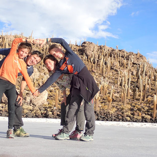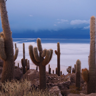 Aux points cardinaux des montagnes noires démarquent les contours du désert. A l’ouest côté chilien des nuages y naissent, que le soleil du soir enflamme, que le parfait miroir d’eau réfléchit. Impression de planète inconnue, douce et sauvage. A la nuit venue, quelques viscaches, gros lapins à queue allongée très répandus en Amérique du sud, fond leur première apparition à nos yeux. Linda fait mouche avec l'appareil photo. A l’aube tel des Robinson, nous montons avec les garçons à la cime de l’île pour guetter l’arrivée de « La flotta ». Nos 2 bus jumeaux sont en retard mais fidèles au rendez vous (ouf) , apparaissant comme deux points dans l’horizon blanchâtre, dégageant de hautes gerbes d’eau à leur passage. Le chauffeur nous invite à ses côtés, au poste de commande de ce navire faisant cap vers Colchani.