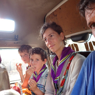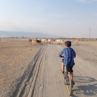 En fin d’après midi, nous rejoignons en vélo un village Masai, accompagnés encore d’Haroun. Curieuse rencontre avec ce peuple à part, partagé entre traditions et modernité. Depuis la piste, le village ressemble à une haie d’épineux. Nous pénétrons ensuite dans cette manyata, petit hameau familial composé de 8 ou 9 cases, et d’une enceinte centrale en branches d'acacia coupée en deux pour protéger le petit du grand bétail. Nous avons l’honneur de pénétrer dans une de leurs maisons, petite case ronde coiffée de feuilles de bananiers, joliment construite et façonnée en terre mêlée de bouse, par les femmes. A l’intérieur, pénombre, parois noircies de fumée, quasiment rien ! Deux petites niches , l’une pour 6 enfants, l’autre on ne sait pas. Il faut dire que les hommes ont jusqu’à 7 femmes, difficile de deviner qui dort avec qui..