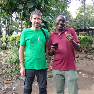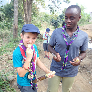 Les scouts sont très enjoués de nous détailler chaque culture. la terre rouge et riche irriguée en toute saison et assommée de soleil procure legumes (manioc,ignames,patates douces,haricots,maïs) et fruits (bananes,fraises,papayes,mangues). Les modestes familles de cultivateurs complètent ces ressources, insufisamment valorisees, par l'élevage de quelques volailles ou poissons. Martin et Simon marchent aussi bien que ces grands scouts dans ces pentes abruptes ,plaisantent sans cesse avec eux , déchiquètent des bouts de canne à sucre et boulottent des fraises ou mûres sauvages tout au long du trajet. Special temps fort et selfies à la Chomba waterfall.