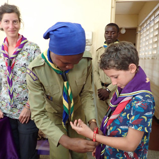 A Dar es Salaam, Fredrick, responsable des relations internationales, a réuni à notre grande surprise une vingtaine de responsables et jeunes scouts pour nous accueillir dans une ambiance très joviale et professionnelle : chansons rigolotes en introduction, présentation formelle de l'organisation scout en Tanzanie et des EDLN en France, témoignages des jeunes scouts sur leurs activités et sujets d'intérêt, échange de présents (banderole Edln, couteau Opinel, foulards et bracelets tanzanien), photo protocolaire devant le bâtiment, puis plantation, par nos soins, de 4 arbustes en l'honneur de notre visite !