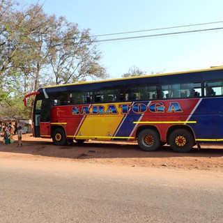 Réveils vaseux, nuit noire sac au dos, station noire de monde noir, changements de programmes, négociations emoussantes, billets retirés des poches, chargement à bloc, tassement des sacs, calage des fesses, bébés langés, rondeurs encastrées. Puis démarrage, chahut de la télé, chemins de terre défoncés, secousses et vibrations incessantes, claquement des parois, essorage grande vitesse, balancements, sueurs froides mêlées de poussière dans le pli des yeux, des membres, cheveux rêches, terre sèche. A défaut de ceinture, airbagages sur les genoux, que la chance soit avec nous et avec notre esprit amen nous à bon port. Répits du goudron, décantation des émotions, sommeil éveillé, pauses express, pipis contenus, menus encas de bananes et cacahuètes exquises, grillées comme le paysage. Sel de roche, huile de palmiers, pains de savons bleus proposés bras tendus aux fenêtres pour alimenter l’interminable machine.