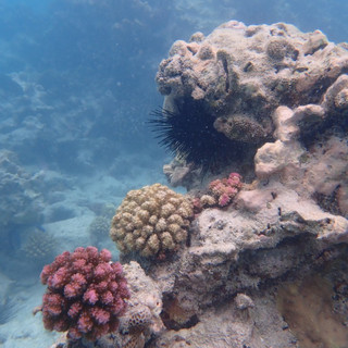 Nous enfilons nos masques ( vous décèlerez une pointe d'humour ironique dans ce propos) et plongeons à la découverte d'un petit récif corallien où se concentrent une multitude de poissons colorés, anémones, chenilles et étoiles de mer, oursins. Sur l’ile , nous posons les pieds sur le banc de sable blanc à marée basse, croissante. Décor fascinant ! Impression d'éternité. Perspectives trompeuses, comme si terre mer et ciel formaient une unique palette de couleurs.