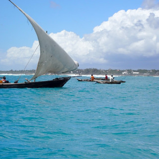 Nous embarquons un matin à marée basse pour l’île de Mnemba. Des femmes fouillent les algues en quête de crustacées, leurs hommes bouchent les fissures de leurs coques de bateaux ( dhows ) , préalablement chauffées au feu de bois, à l’aide d’étoffes de coton.