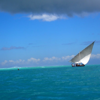 Nous quittons Pangani en petit bateau à moteur pour rejoindre l’archipel de Zanzibar à env. 50 kms au large, en compagnie de quelques villageois. Le voyage commence Pole Pole ( tranquillement), sur une mer d’huile, mais peu à peu le ciel devient noir, le vent se lève, de sombres nuages grimpent dans le ciel qui se vide littéralement sur l’océan agité. Nous courbons l’échine et nous en remettons à la confiance que l’on peut accorder à notre coquille de noix pour nous maintenir à flots jusqu’à Zanzibar.
