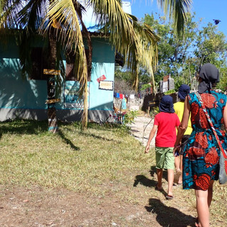 Ainsi nous traversons l’île dans une humeur joyeuse, fesses en selle,ciel sur la tête, dans l’insouciance de ne pas savoir le matin dans quel endroit nous coucherons le soir. Une mélodie, un doux sifflement plus ténu que la douleur qu’il réveille sur les lèvres gercées de soleil. Une ombre se résumant à un point à l’heure de midi dans des longues lignes droites bordées de cultures (maïs, papayes, tomates, cocotiers) , parfois un ciel de plomb qui se soulage d’ une averse , l’occasion d’une halte sous un bosquet. Toujours des Hujambo Sijambo mambo vipi safi Poa Habari Nzuri, salutations de circonstance, des sourires , des airs surpris, des pouces levés pour saluer notre embarcation « à l’africaine ». Il est vrai qu’ici effectuer la traversée de ile en vélo, avec nos enfants, ne parait pas concevable.