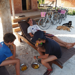 Au village, nous faisons la connaissance d’Isaik qui nous concocte un repas de poissons sur la plage. Dans ce cadre, nul intérêt pour lui d’investir dans des murs pour exprimer son talent de cuisinier…une table en plastique recouverte de feuilles de bananiers, des poissons sortis de l’eau et directement jetés sur le grill, un riz blanc accompagné d’une sauce coco tomates, une salade de fruits et légumes frais, de quoi vraiment en faire tout un plat…