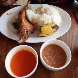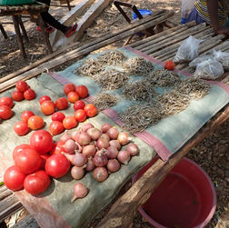 A l’heure des repas, nous ciblons avec préférence les petits commerces de rue proposant une table, et parfois quelques chaises (ou pas), recouverts de tôle ondulée. Même si la propreté de la table peut être contestable, la nourriture y est fraîche et locale, le lieu est ventilé, la cuisson est faite au sol à l’arrière, sur un foyer de 3 pierres entre lesquels le bois alimente les flammes.
